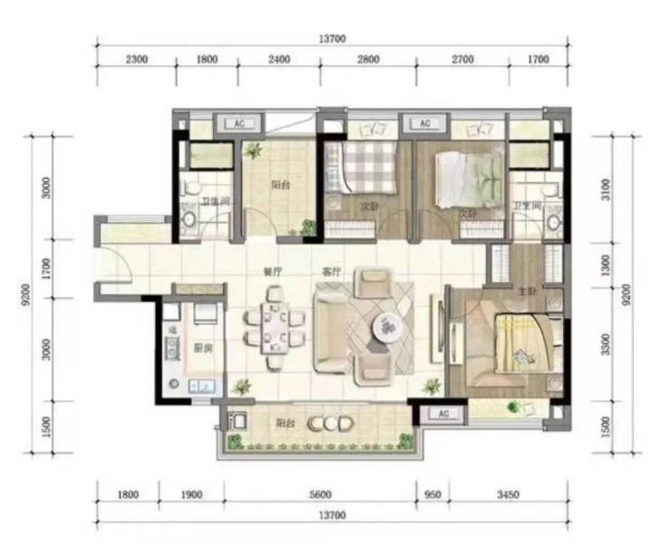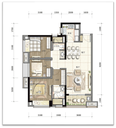 动静分区:三房同一排布,减少过道空间,增加使用面积,私密性强。