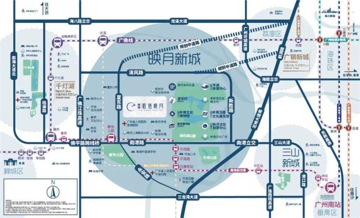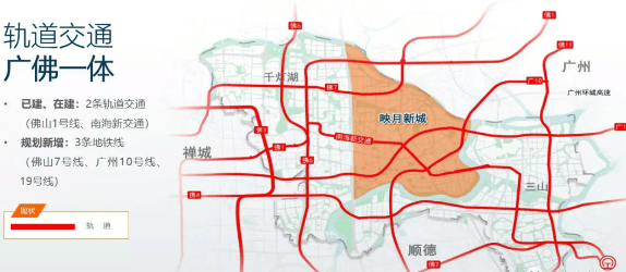 道路交通:项目周边形成“三横两纵”交通格局,路网通达性极佳,3公里可达佛山一环入口,4.5公里到达广州环城高速,25分钟可达广州南站,40分钟到达珠江新城。