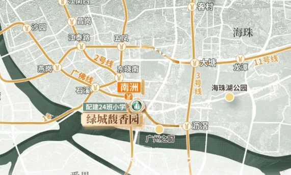 绿城馥香园占据不可复制的双地铁上盖优势——紧邻地铁2号线与广佛线换乘站南洲站,直线距离仅约100米。从南洲站C1口出站,即可直达项目所在区域,真正实现“出站即归家”。更值得一提的是,项目规划地库直通地铁站,全程风雨无阻,这一设计在海珠尚属首创,极大提升了日常出行的便捷性与尊崇感。