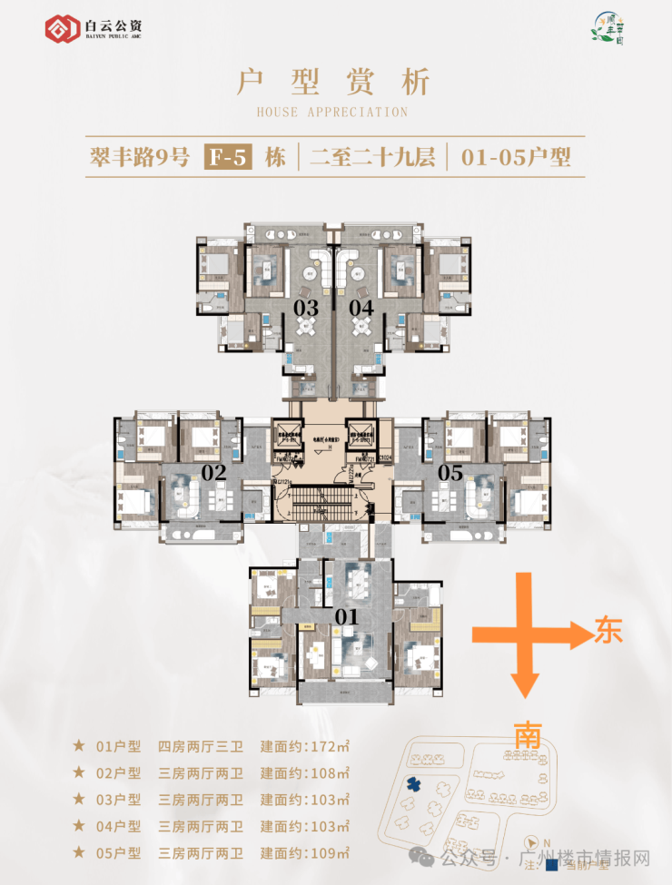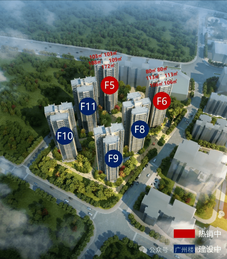 目前第五期F5与F6栋现楼在清货,户型涵盖了建面约80-172㎡二至四房。