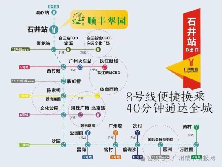距离地铁8号线石井站仅约700米,两站直达白云站,20分钟直达荔湾和越秀核心商圈,一线可换乘8条线路,无缝通达全城。