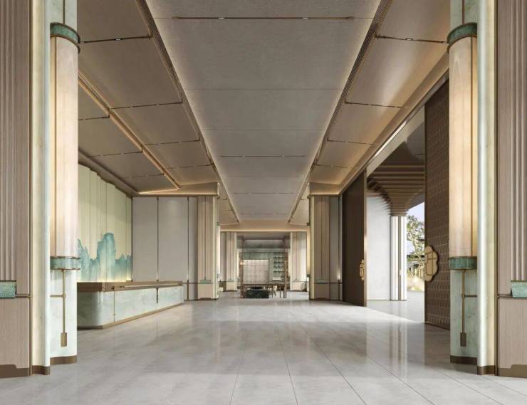 项目入口处的门楼更是堪称艺术品。长达60米、挑高11米的“海珠西门王”,采用雅博白大理石打造墙面,门头基座为巴西安第斯雪景大理石,门楼两侧的柱头采用宋汝窑青瓷装饰。凤鸟冠顶、飞檐翘角等设计元素,彰显出浓厚的文化底蕴。同时,借助参数化技术将《千里江山图》铸就成流动金属画卷,让传统文化在现代科技中焕发出新的生机。