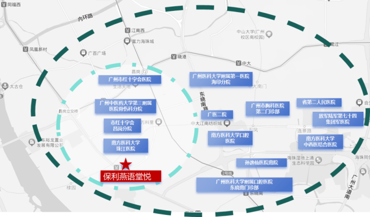 从项目出发,步行约300米即可到达广州医学院第二附属医院(西院区),步行约500米可达南方医科大学珠江医院(全国首批三甲医院)。这两所医院都是广州市乃至广东省内的顶级医疗机构,拥有先进的医疗设备、精湛的医疗技术和丰富的临床经验,能够为业主提供全方位、高品质的医疗服务。