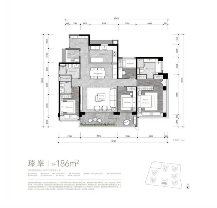A:主力户型为110㎡三房(可改四房)、125㎡三房+灵动空间、141㎡四房、186㎡四房三卫。