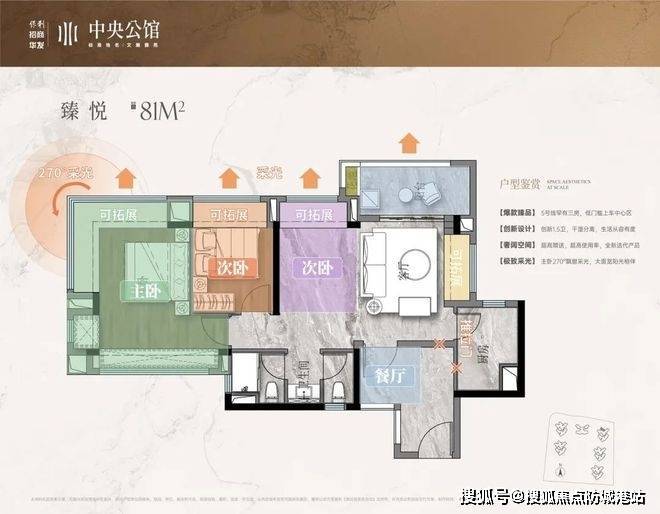 115㎡四房:四开间朝南,6.5米景观阳台,主卧套间配独立卫浴。