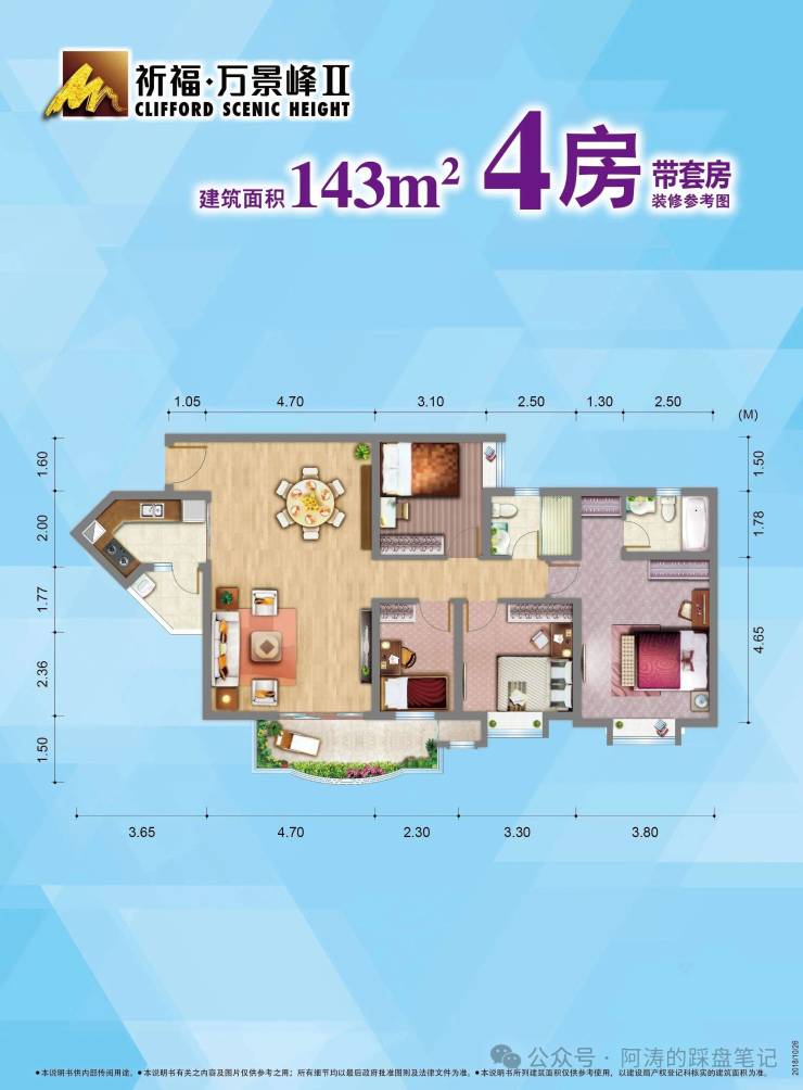 130-143㎡四居:改善型户型,四房两卫,大横厅设计,阳台朝南,适合改善家庭,豪装交标质感扎实。