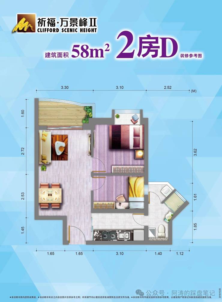 58㎡一居:总价 99 万起,适合单身青年、刚需过渡,户型方正,明厨明卫,阳台朝南,采光良好。