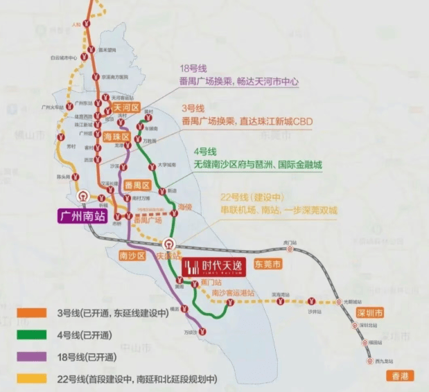 时代天逸傲立南沙自贸区核心板块——庆盛枢纽与区府交汇处,占据城市发展主轴。项目距地铁4号线黄阁站A出口仅约200米,真正实现“地铁上盖”生活。从这里出发,1站即达南沙区政府,2站直达庆盛高铁站,无缝接驳广深港高铁,30分钟内直抵香港西九龙站,高效连接深圳北、广州南等核心枢纽,轻松融入“广深港半小时生活圈”。