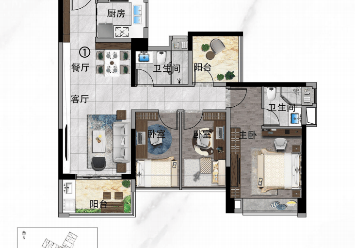 该项目推出的主力户型是99㎡的三室两厅两卫,所有户型均朝南设计,保证了充足的自然光照。客厅采用经典竖厅格局,实现了动静分区,使家庭成员在享受各自活动的同时互不干扰。此外,双阳台设计不仅增加了居住空间的实际使用面积,还为居民提供了一个放松身心的好去处。对于有小孩的家庭来说,个性化灵动空间的设计更是满足了不同年龄段孩子的成长需求。