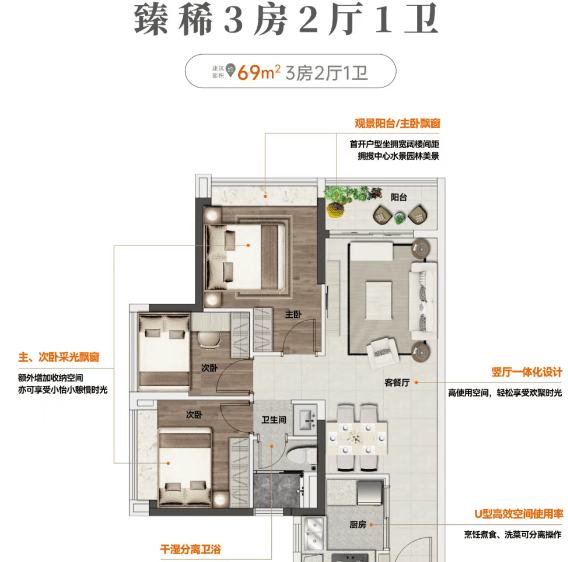 69㎡ 三房两厅一卫:拥有阔绰观景阳台,主次卧采光飘窗,干湿分离卫浴,U型厨房。