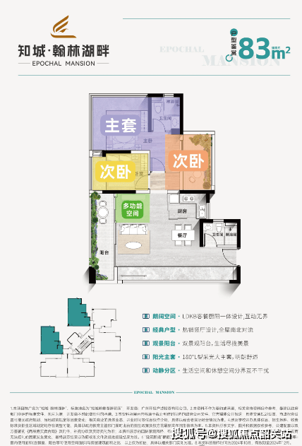 项目主打66-103㎡三至四房,通过LDKC客餐厨阳一体化设计,形成“共融巨厅”,实现空间极致利用。所有户型均采用全明设计,通风采光极佳,并配备全景飘窗、宽景阳台,盛邀景观入室。具体户型亮点如下: