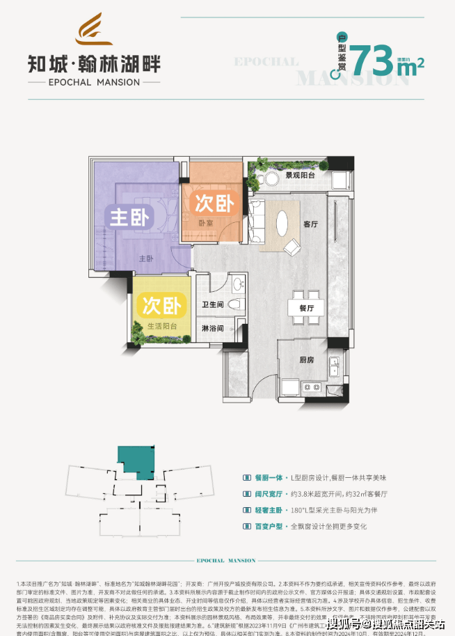 73㎡舒适3房:L型厨房,餐厨一体;约3.8米超宽开间,打造约32㎡宽敞客餐厅;全飘窗设计,空间多变。