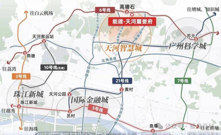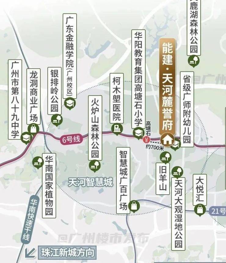 地铁——广州地铁6号线高塘石站700米左右,可直通天河、越秀等核心主城区;