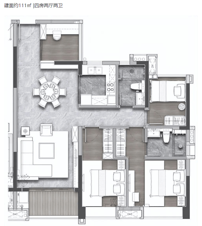 01户型:建面约111㎡,四房两厅两卫,宽敞舒适,适合追求高品质生活的家庭。