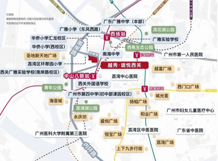 项目距地铁5/11号线(在建中)中山八站步行距离仅80米,紧邻刚启用的中山八路交通枢纽停车场,实现“P+R”智慧换乘便利。未来地铁通车后,2站可达陈家祠、纪念堂,3站至公园前,无需换乘就能直达珠江新城、琶洲、金融城三大CBD,早高峰时段自驾经内环接驳中山路、东风路等主干道,至珠江新城耗时约30分钟。依托双地铁与主干道交织的路网,既能快速通达全城核心商圈,又能借助枢纽优势便捷衔接广佛两地,日常通勤与跨城出行都无需过多耗费时间。