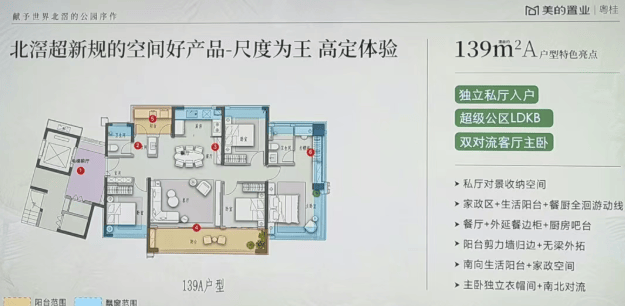 第三款户型是139㎡A户型,该户型主打“品质改善”,针对追求高品质生活的家庭打造,LDKB一体化设计是该户型的核心亮点。LDKB一体化设计,即客厅(Living room)、餐厅(Dining room)、厨房(Kitchen)、阳台(Balcony)一体化设计,这种设计打破了传统空间的界限,将四个空间完美融合,不仅提升了空间的通透度与采光效果,还能最大化利用空间,提高空间利用率。同时,LDKB一体化设计也缩短了家人之间的互动距离,让家人在烹饪、用餐、休闲的过程中能够随时交流,营造温馨和谐的家庭氛围。