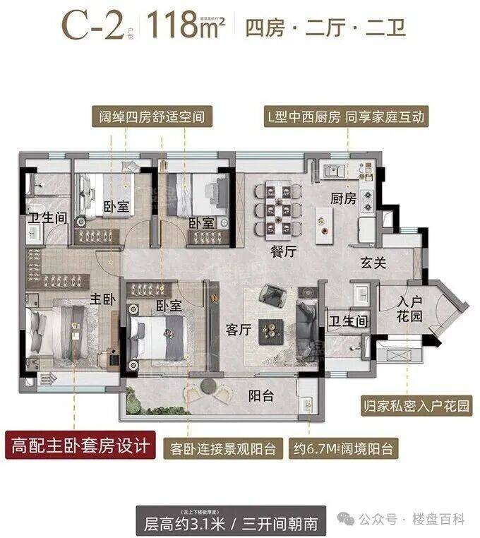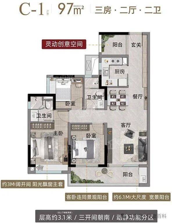 户型方面,项目主打建面约 97-168 平方米 3-4 房,均为南向设计,最大化采光面宽与空间感,其中 97 平高实用 3+1 房户型,层高约 3.1 米,阳台净宽 6.1 米,联通客厅和次卧,引光入室,清风自来,可满足三代同堂居住需求;168 平双主套王牌 4 房户型,南北对流,拥有约 9.2 米瞰山大阳台,推窗即见山景,南向约 3.7 米主卧套间,配置雅致,彰显居住尊贵感。所有户型均采用高实用率设计,布局合理,动静分离,贴合现代家庭居住习惯,可根据家庭需求灵活改造空间,实用性与可塑性兼具。