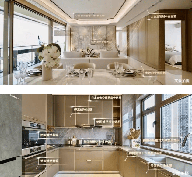 答:项目精装标准超过万元/㎡,甄选国际一线品牌,包括博世五件套(燃气灶、油烟机、洗碗机、蒸烤箱、冰箱)、大金三管制中央空调、贝克洛系统门窗、高端奢石(潘多拉奢石、铂尔曼白奢石)等;同时配备主卧卫生间面膜冰箱、厨房独立防潮除霉空调、厨餐厅独立冰箱与热净饮水机等高配设施,品质有保障。