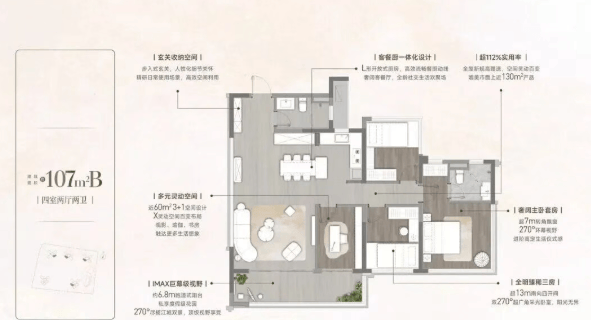 主力户型涵盖建面约95㎡、107㎡、128㎡、142㎡四款,均为南北通透、全明格局。得益于新规优化,项目整体使用率突破130%,远超市场平均水平。以128㎡户型为例,实际可享空间接近170㎡,相当于用刚需价格享受改善级尺度。