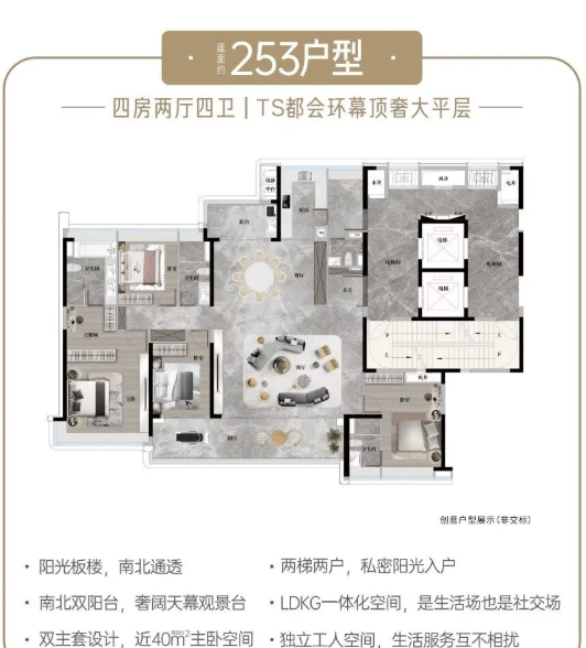 205㎡与253㎡四至五房:中轴楼王,双主卧套房、近10米巨幕阳台、总统级主卧奢配;