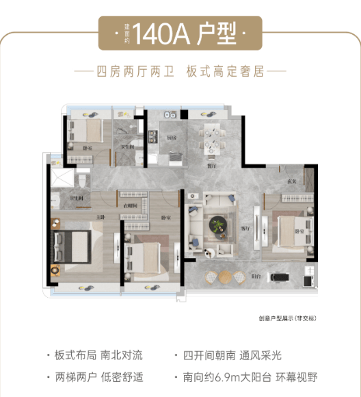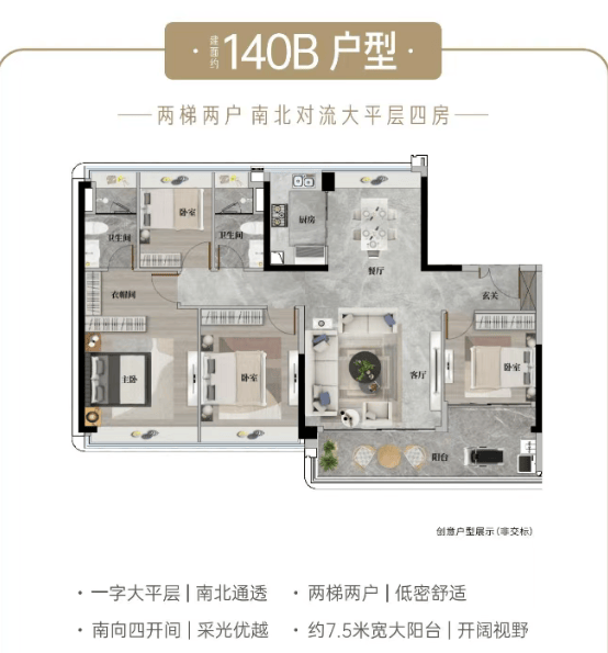 140㎡四房:高性价比之选,7.5米宽阳台、四开间朝南,实用率极高;