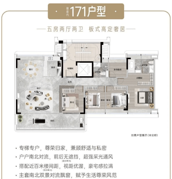 所有户型均为板式布局,南北对流,阳光满屋,专梯专户设计保障私密尊崇,真正实现“少数人的生活”。