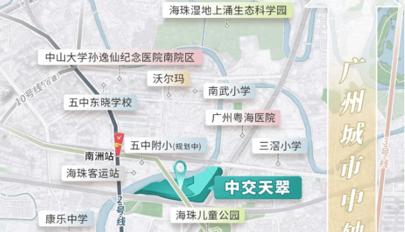 中交天翠坐落于海珠区AH101314地块,即三滘立交核心区域,北接广州塔CBD,南望珠江后航道,真正意义上占据城市发展的黄金轴线。项目直线距离地铁2号线与广佛线交汇的南洲站仅约500米,无论是通勤珠江新城、琶洲会展,还是前往佛山千灯湖片区,都极为便捷。周边广州大道、广州绕城高速等主干道环伺,构建起高效立体交通网络,让出行从容不迫。