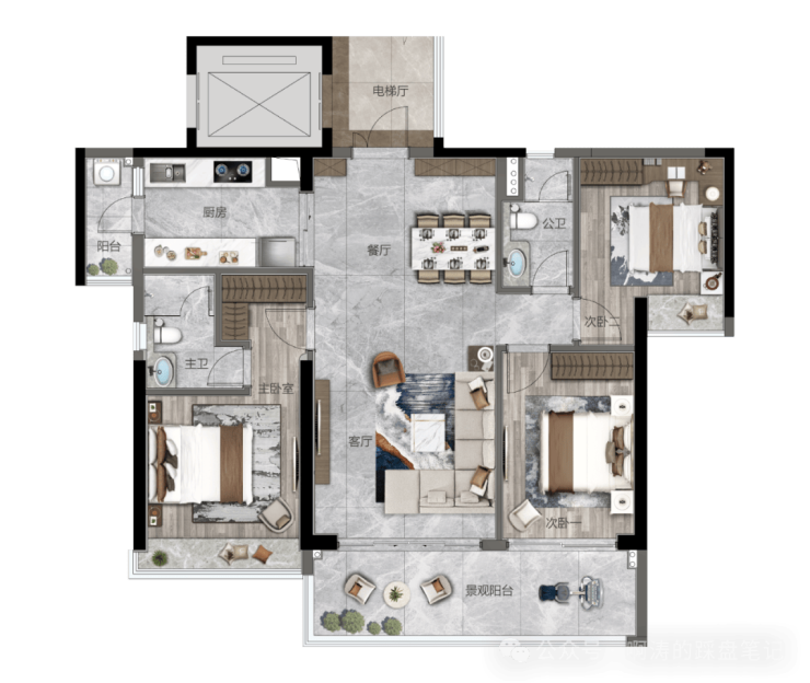项目由梁志天团队、汉森伯盛及HWCD等设计机构联合操刀,外立面采用现代简约风格,以浅灰与米白为主色调,搭配横向线条与玻璃元素,营造出轻盈通透的视觉效果。建筑布局顺应地块高差,形成错落有致的天际线,既呼应周边山体轮廓,又避免了高层建筑的压迫感。板式结构设计确保多数单元实现南北通透,配合低密梯户比(如2梯3户),提升了居住私密性与舒适度。