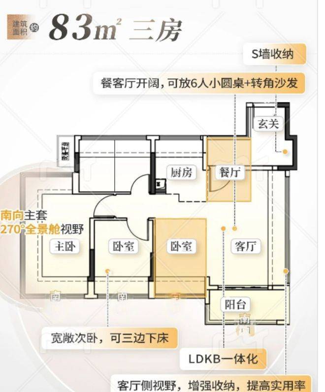 户型设计亮点满满。项目全盘 4 栋楼共 530 户,均为 27 - 37F 高层,产品面积段为建面约 83 - 126㎡,全南向四至五空间。建面约 83㎡的南向三房两卫,单边位预测套内面积更大,且相比之前新规户型有所升级,次卧尺度更大可三边下床。99 平四房两卫户型,拥有 IMAX 宽景阳台、主卧三面环幕视野设计,还能灵活打造 “超聚厅”。109㎡四房南北对流,两个次卧空间大,4.5 开间朝南,双面宽大阳台,玄关处 800 库增强收纳。126㎡五房两卫,5.5 开间朝南,四间卧室朝南,南北对流,客餐厅尺度阔绰,同样有 800 库玄关,舒适度与功能性兼具。整体户型设计合理,得房率高,充分考虑了居住体验。