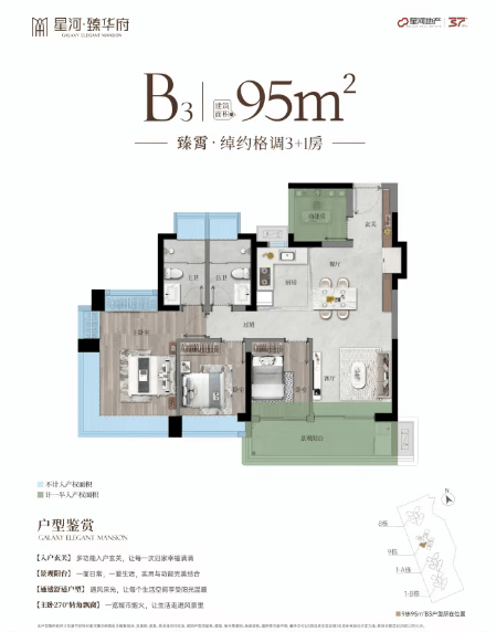 95㎡3+1房:分布在1号楼和9号楼,入户飘窗玄关,主卧配备270°观景飘窗。