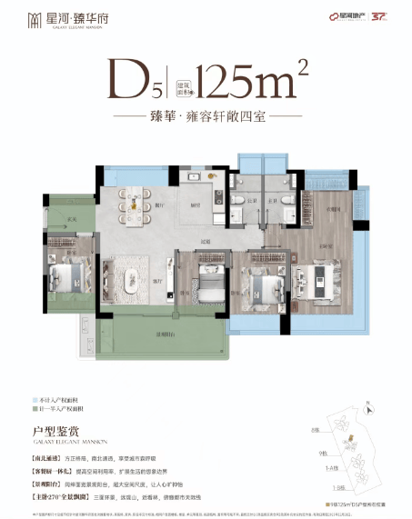 125㎡四房:分布在9号楼,迎宾入户花园设计,宽幕景观阳台,主卧配备270°瞰景飘窗。