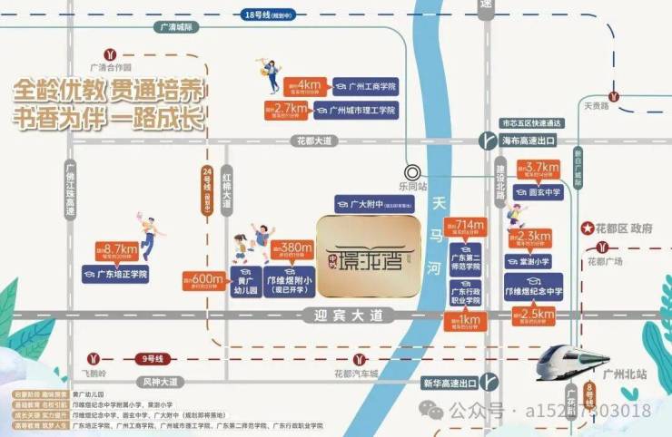 项目构建多维一体化立体交通路网,轨道交通与城市主干道双向赋能,全城通勤便捷度拉满。项目周边 2 城轨、3 地铁、4 高速环伺,实现城市快速通达,享有 1 小时大湾区生活圈。城轨方面,项目快速接驳广清城轨、新白广城轨,实现与广州中心城区及周边城市快速连接;地铁方面,规划地铁 9 号线、18 号线北延段、24 号线,未来地铁出行便捷;高速方面,接驳机场高速、大广高速、乐广高速、北二环高速,快速抵达广州白云国际机场、珠江新城 CBD 等核心区域。项目距离 9 号线汽车城站约 2.7 公里,设有楼巴接驳地铁站,解决短途出行问题,形成地铁出行、自驾通行、楼巴接驳三维完备的出行体系,适配全家庭全场景通勤需求。