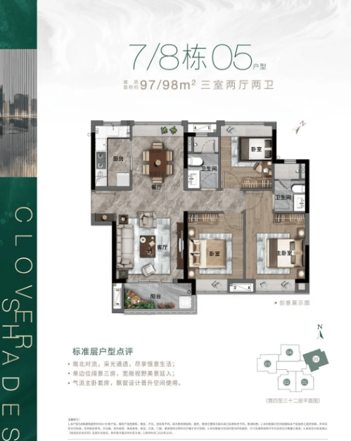 95–98㎡三至四房:主卧带飘窗,部分设独立玄关,动静分区清晰;