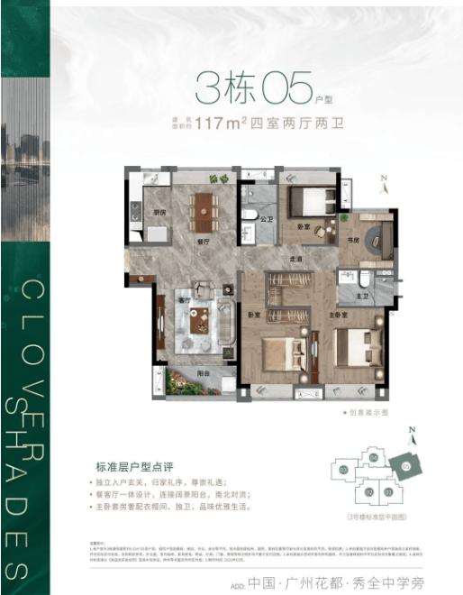 117㎡四房:阔绰客厅+双卫+主套设计,满足二胎或三代同堂需求。