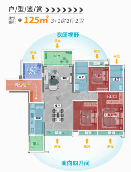 125㎡四房:南北对流单边位,55㎡LDKB奢厅+5.7米阳台,270°环幕窗揽景。