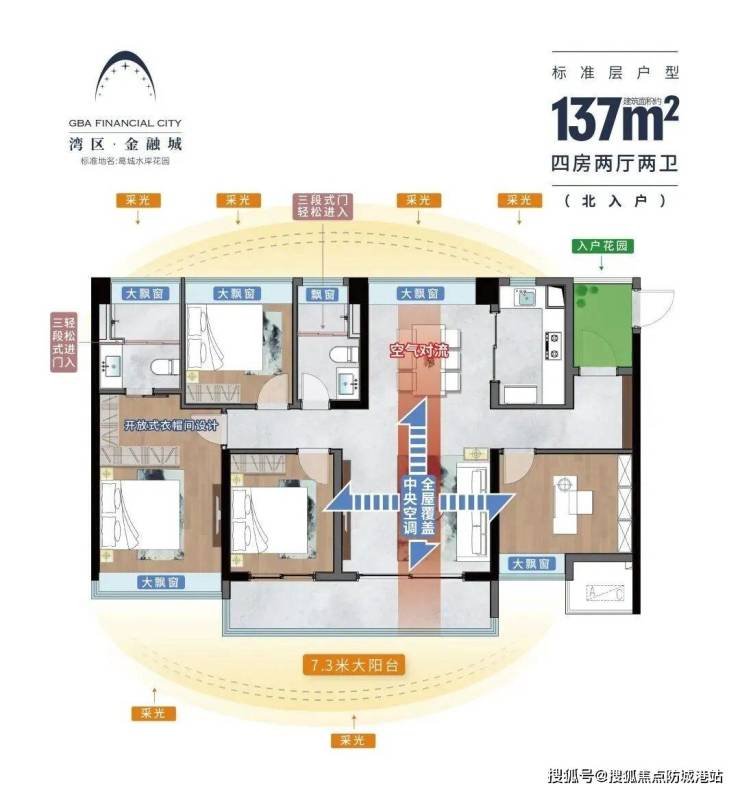 115㎡3+1房:超30㎡餐客通厅,约7米南向观景阳台,南北通透,总价约322万元起。