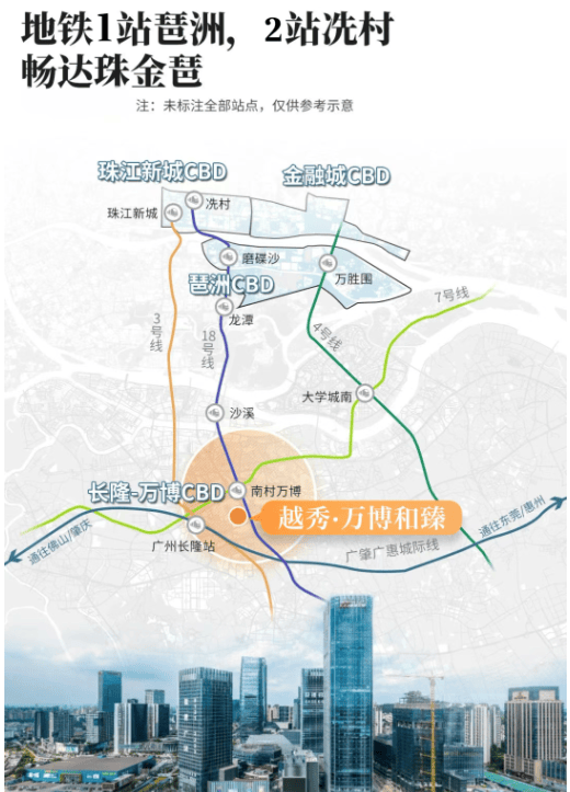 越秀万博和臻扎根番禺长隆万博CBD核心腹地,作为片区城市更新标杆一号作品,占位番禺城市发展中轴核心,承接板块超强产业与城市焕新红利,地段价值稳居番禺第一梯队。项目地处万博成熟商务区与长隆度假区衔接的黄金区位,左拥长隆文旅资源,右揽万博繁华商圈,同时三面被锦绣香江高端墅区环绕,在繁华CBD中坐拥难得的静谧居住环境,实现出则繁华、入则静谧的居住格局。片区产业实力雄厚,汇聚超两万七千家优质企业,集结希音、欢聚时代、小米、携程、拼多多等头部科创与电商巨头,海量高端就业人口持续涌入,为板块房价与居住价值提供坚实支撑。交通层面构筑三地铁+双快速的立体通勤体系,步行可达7、18号线交汇南村万博站,依托18号线湾区极速轨交,一站直达琶洲CBD、两站直达珠江新城核心商圈,轻松串联广州南站、老黄埔、金融城等核心板块。同时紧邻华南快速、新光快速两大城市主干道,自驾可快速通达全城核心商务区,完美适配湾区通勤、主城商务办公、日常出行的多元需求,执掌城市发展速度。