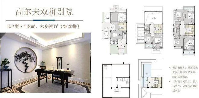 别墅户型覆盖了多个经典面积段,比如418㎡的低密高尔夫别院、503㎡的山海别院,以及更大尺度的647㎡城央院居型产品。这些户型普遍强调大面宽、大开间,客厅和主卧的景观面基本都能直面高尔夫球场、远处海景或者园区内部的山水园林。双拼的私密性加上低楼栋高度,让居住的仪式感和归属感都更强一些。