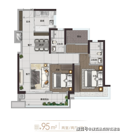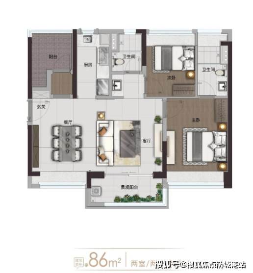 【建面约86㎡二房户型】:刚需首选户型,户型方正紧凑,无浪费空间,全南向布局,采光通风俱佳;客厅连接景观阳台,延伸室内空间,同时可欣赏社区园林美景;主卧配备飘窗,增加使用空间与采光,提升居住舒适度;双卫设计,解决家人抢卫生间的尴尬,保障生活私密性,适配新婚夫妻、单身贵族等刚需人群。