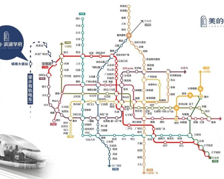 从项目出发,通过主干道可快速到达广州各大主城区。未来规划中的佛山地铁5号线(甘蕉站距项目300米)、佛山地铁8号线以及里水有轨电车(镇南大道站距项目约900米)将进一步提升区域交通便利性。此外,项目可通过地铁/有轨电车直接串联广州地铁12号线里横路站,实现与白云、荔湾、越秀及天河等地的无缝连接。