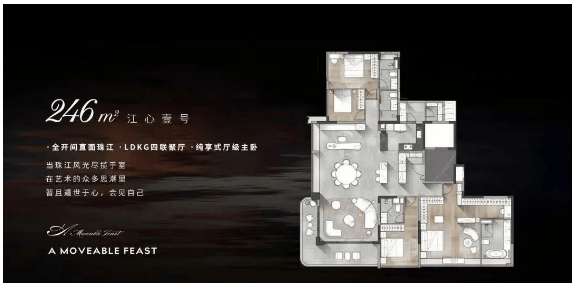 中海映澜台产品线聚焦改善型需求,户型面积段涵盖140㎡、185㎡、205㎡及246㎡,目前仅余205㎡与246㎡的高层单位在售。所有户型均为南向布局,最大限度引入江景视野与自然采光。其中,140㎡户型虽为入门级,但主卧与阳台仍可享江景;而185㎡以上主力户型则实现全屋观江,客厅、主卧、次卧甚至餐厅均面向珠江,真正做到“推窗见江”。205㎡户型采用LDK一体化设计,246㎡则配备独立家政间、双主卧套房等高端配置,空间尺度与功能分区均对标一线城市顶级大平层标准。尤为难得的是,这些户型均为现楼实景,买家可实地验房,避免效果图与现实落差的风险。
