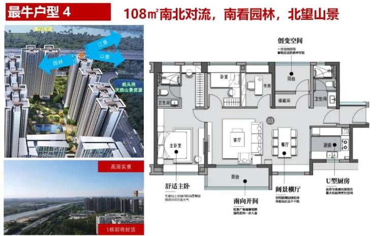 - **108㎡四房两厅两卫**:奢阔四房,主卧独立衣帽间,全明户型,高层可瞰山景、江景、园景三重景观,改善优选。