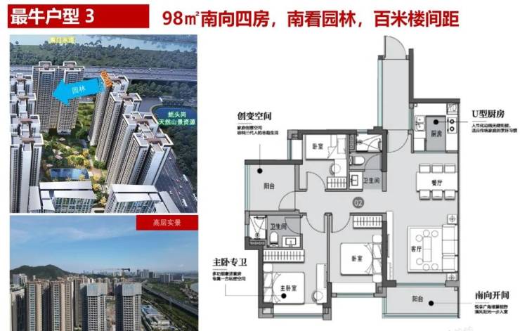 - **98㎡四房两厅两卫**:高拓四房,约3.5米客厅开间,南向无遮挡,百米楼间距,景观视野佳,满足二胎家庭需求。