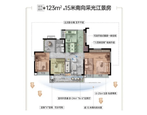 户型设计:高得房率 + 南向江景,全龄改善适配