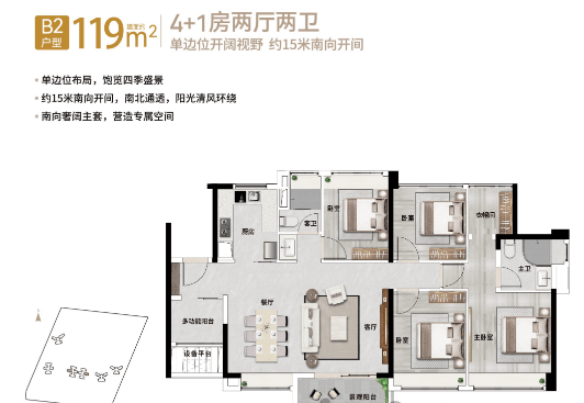119㎡4+1房2厅2卫:单边位布局,南北通透,适合改善型家庭。
