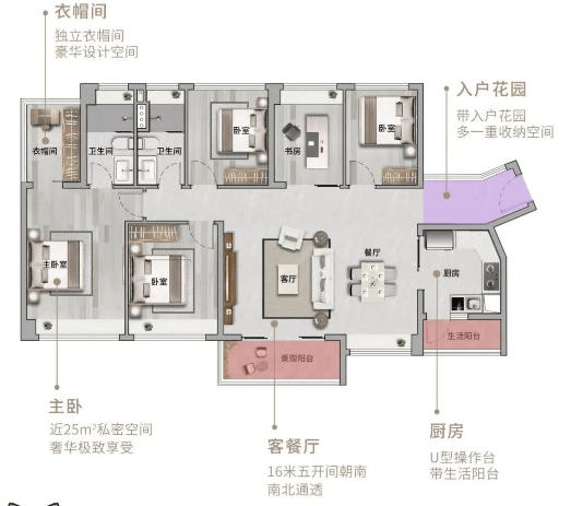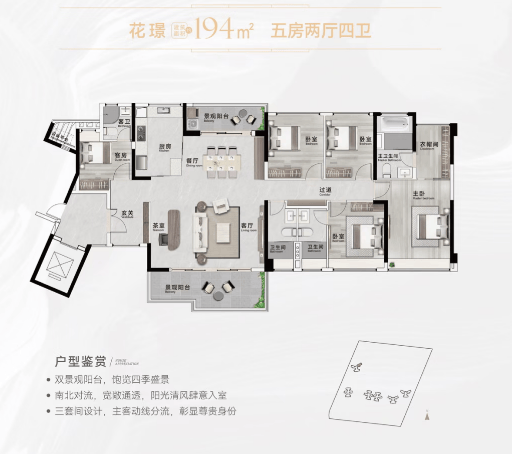 194㎡五房2厅4卫(三套房):豪华主套,南北对流双景观阳台。