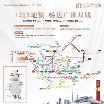 【新希望金沙公馆】坐落于广东省佛山市南海区里广路,紧邻永润广场西侧,近南海双语实验学校。其距离广州荔湾仅约4公里,距广州市中心约6公里,可以说“比广州更近广州”。这样的地理位置使得居民可以轻松享受广佛两城的便利生活。此外,项目周围规划有五桥三铁一轨,包括有轨电车(永润广场站)、地铁6号线、12号线等,为居民提供了便捷的出行条件。