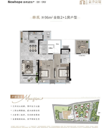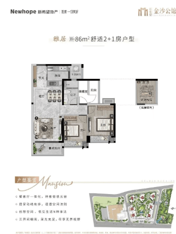 【新希望金沙公馆】提供的户型多样,面积从约86㎡至117㎡不等,涵盖了从舒适2+1房到宽境3+1房的不同户型选择。所有户型均注重空间利用的最大化,通过精心设计实现了户户景观的最佳效果。尤其是部分户型配备了超大阳台和阔景视野,让居住空间更加宽敞明亮,提升了居住体验。