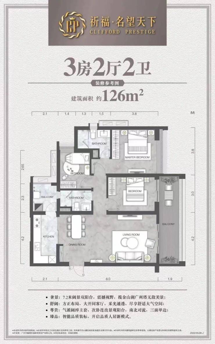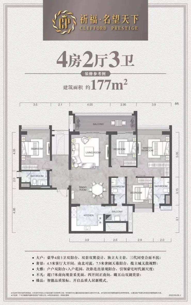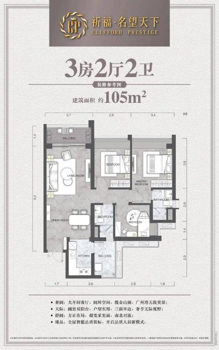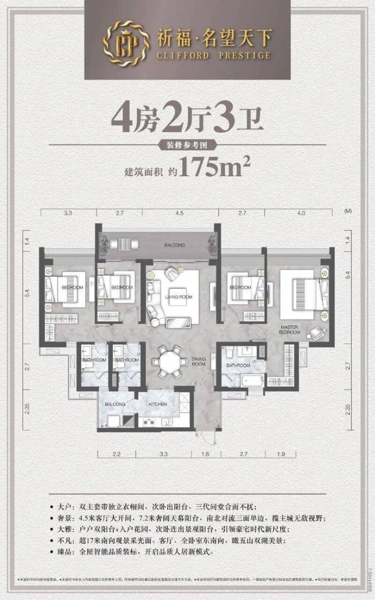 在产品力打造上,祈福·名望天下深谙豪宅人居精髓。项目户型面积段涵盖78至222平方米,灵活规划为二房至五房,能够满足不同家庭结构的居住需求。设计上采用先进的风车型布局,实现了户户南北对流、三面单边的优良格局,极大提升了室内的通透性与私密性。同时,项目严格遵循最新建筑规范,通过优化结构设计实现了极高的得房率,让每一寸空间都物尽其用。在交付标准上,项目甄选国际一线品牌,融入智能化健康人居系统,从细节处彰显豪宅质感,旨在为广州树立一个超前远见的生活范本。