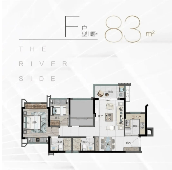 客餐厅一体化,连接阔景阳台,部分高楼层可望砺江;
